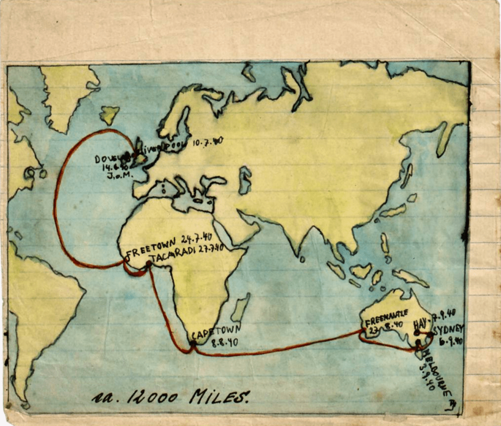 It was a dangerous 57-day voyage in waters crawling with German submarines, with little food, no clean water, one bar of soap and one towel for every 100 men, and just 10 toilets for almost 2500 men. The Dunera was hit by three torpedoes in the Atlantic, which miraculously glanced off its hull.